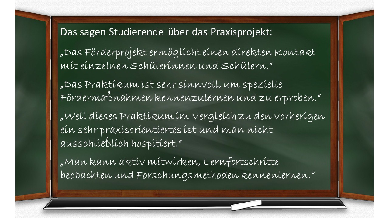 Studierende der Unterrichtsfächer Deutsch, Englisch und Mathematik haben die Möglichkeit, ihre Praxisphase semesterbegleitend an den beteiligten Schulen und außerschulischen Einrichtungen durchzuführen. Für ein Schulhalbjahr werden die Studierenden in den jeweiligen Förderkonzepten eingesetzt und betreuen z.B. kleinere Fördergruppen, übernehmen die Förderung einzelner Schüler*innen oder bekommen im Rahmen der Binnendifferenzierung spezifische Aufgaben. Vielfalt und Heterogenität als selbstverständlich wahrzunehmen und sich mit den Lernvoraussetzungen, Lernentwicklungen und Lernprozessen von Schüler*innen intensiv auseinanderzusetzen, sind wesentliche inhaltliche Ziele des Projekts.