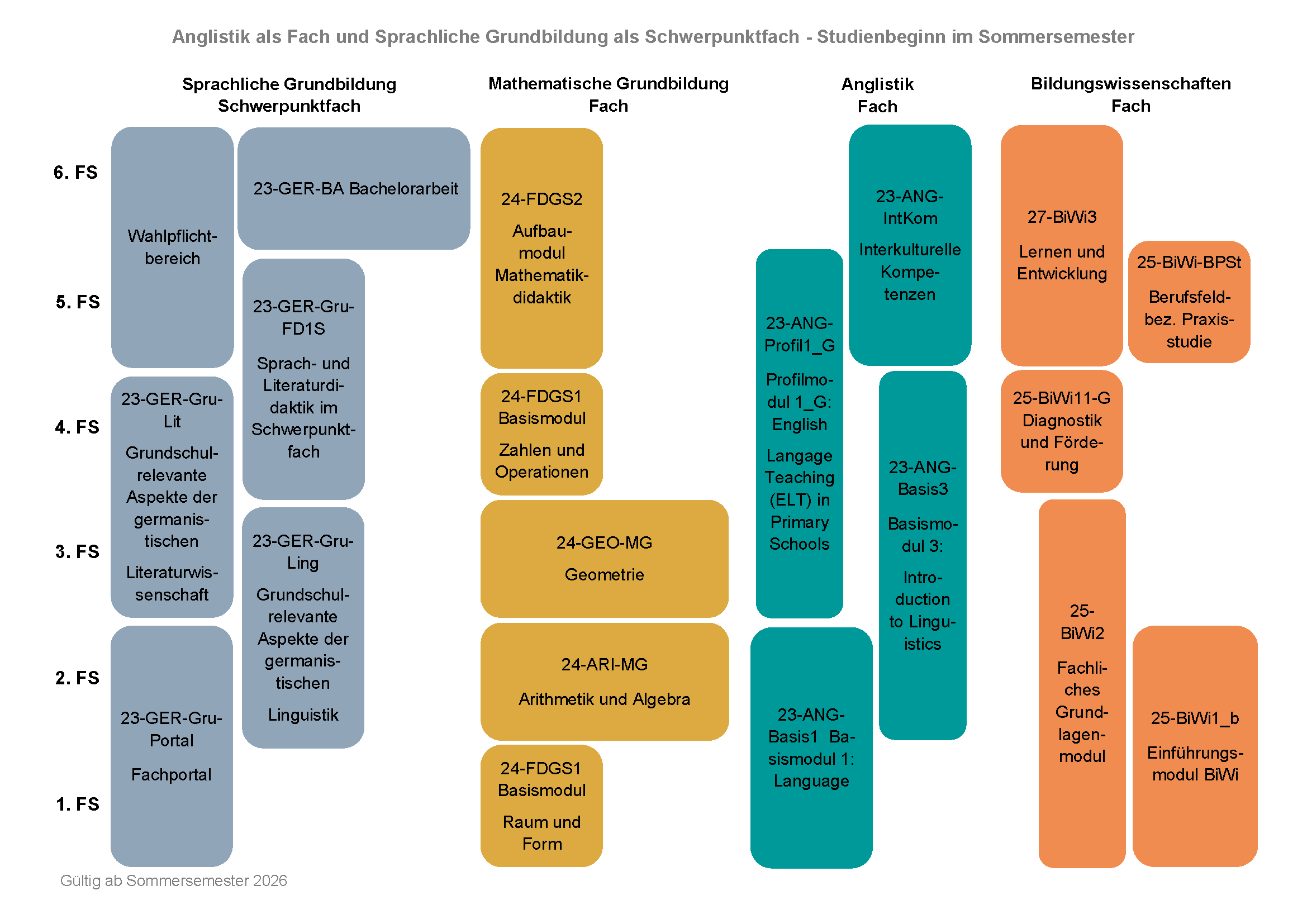 Empfohlener Studienverlauf für das Lehramt an Grundschulen mit Anglistik als Fach und Sprachlicher Grundbildung als Schwerpunktfach bei einem Studienbeginn im Sommersemester
