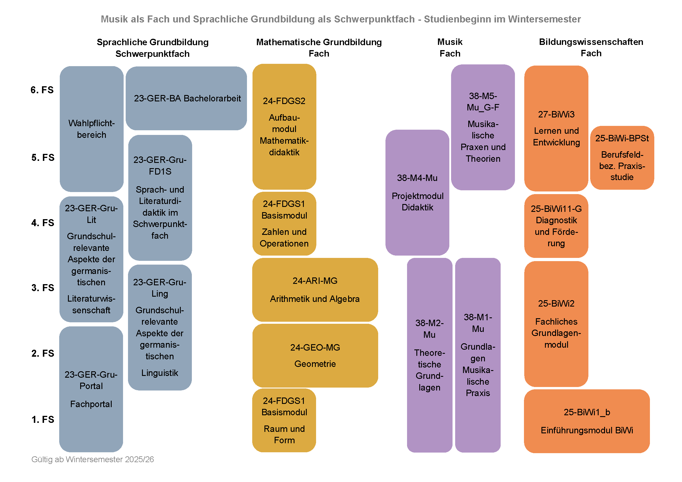 Empfohlener Studienverlauf für das Lehramt an Grundschulen mit Musik als Fach und Mathematischer Grundbildung als Schwerpunktfach bei einem Studienbeginn im Wintersemester