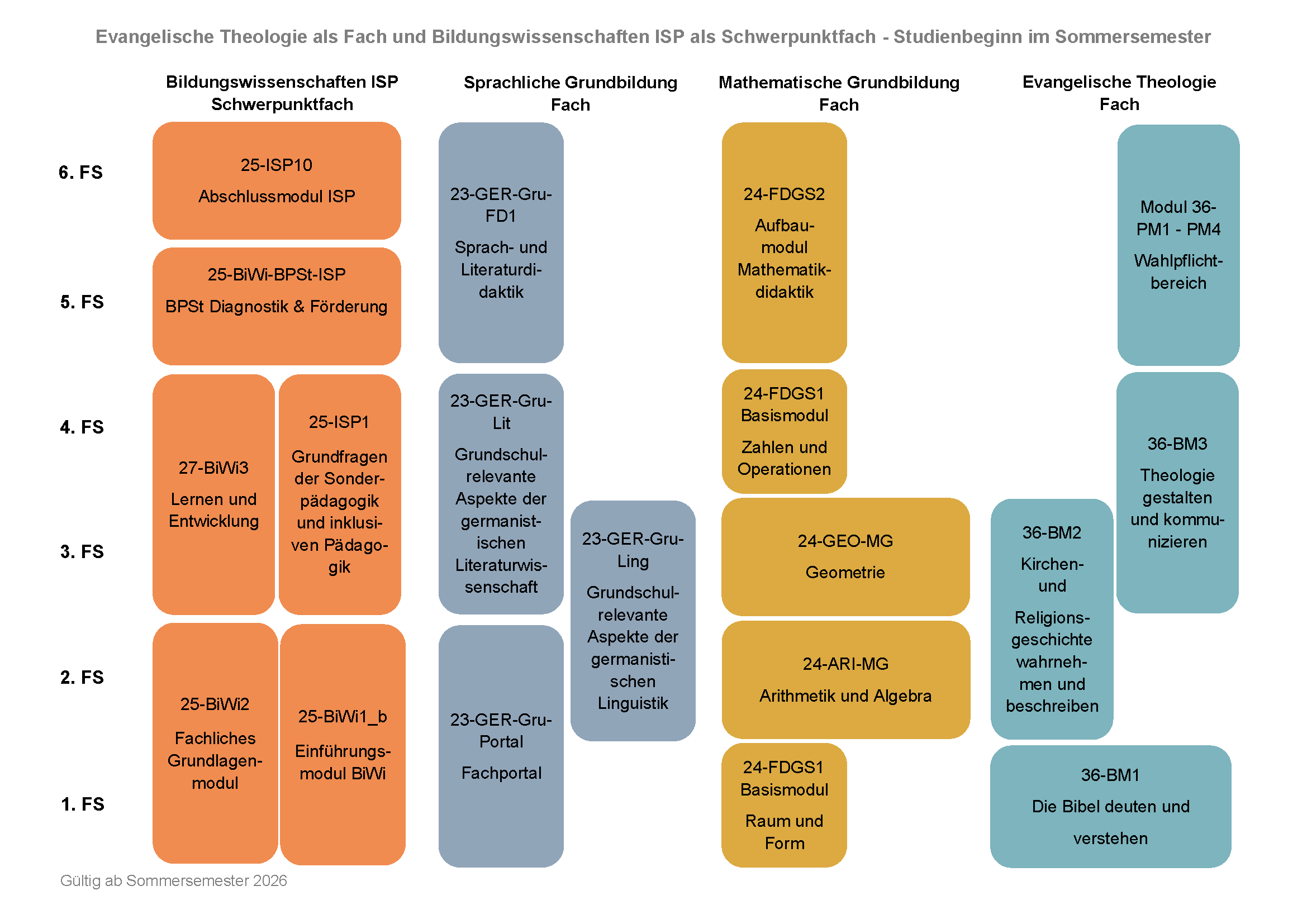 Empfohlener Studienverlauf für das Lehramt an Grundschulen mit Evangelischer Theologie als Fach und  Bildungswissenschaften mit integrierter Sonderpädagogik als Schwerpunktfach bei einem Studienbeginn im Sommersemester