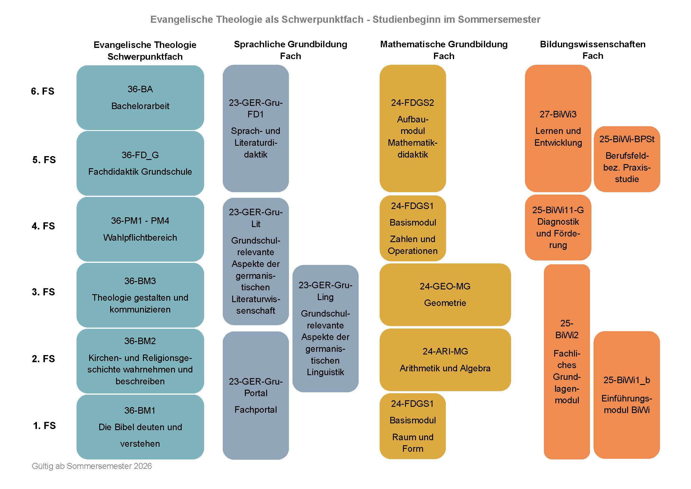 Empfohlener Studienverlauf für das Lehramt an Grundschulen mit Evangelischer Theologie als Fach und Mathematischer Grundbildung als Schwerpunktfach bei einem Studienbeginn im Sommersemester