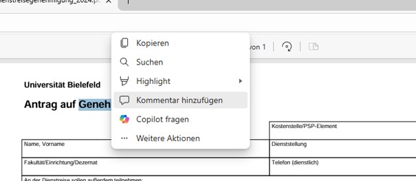 Gewünschte Textstelle für einen Kommentar durch Doppelklick markieren und auf Kommentar hinzufügen klicken.