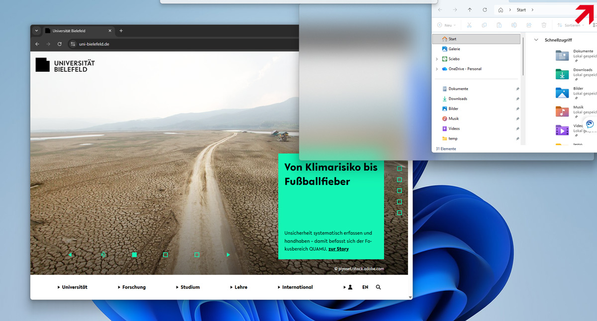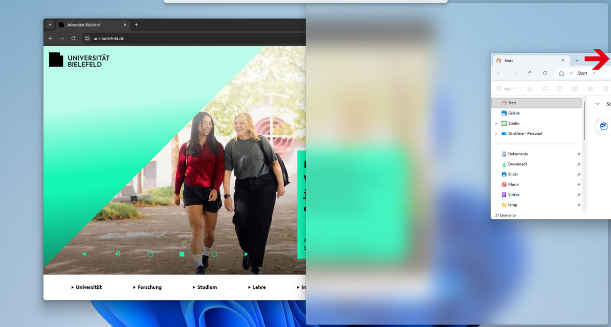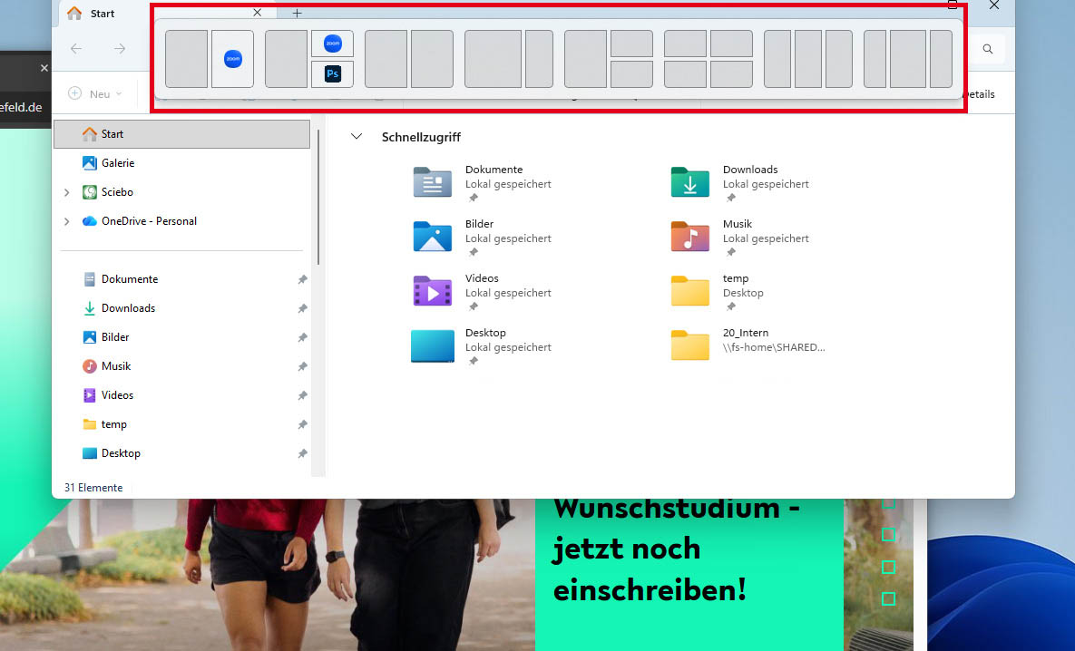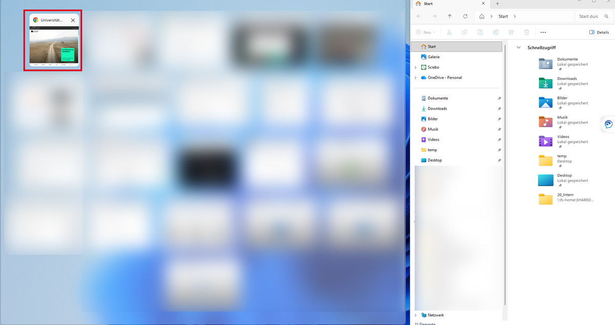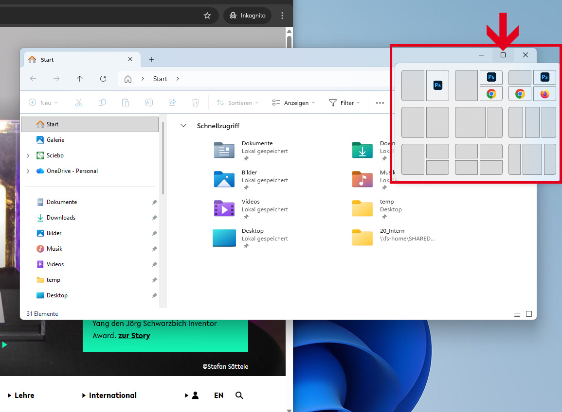 Um besonders bei großen Monitoren Fenster von Anwendungen oder mehrere Dokumente übersichtlich anzuordnen, gibt es unter Windows 11 den sog. Snap Assist. Dieser bietet unterschiedliche Layouts und Größenaufteilungen.
