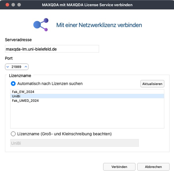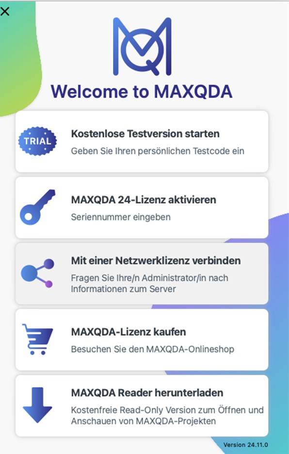 MAXQDA nach der Installation starten und im Aktivierungsdialog die Option Mit einer Netzwerklizenz verbinden auswählen.