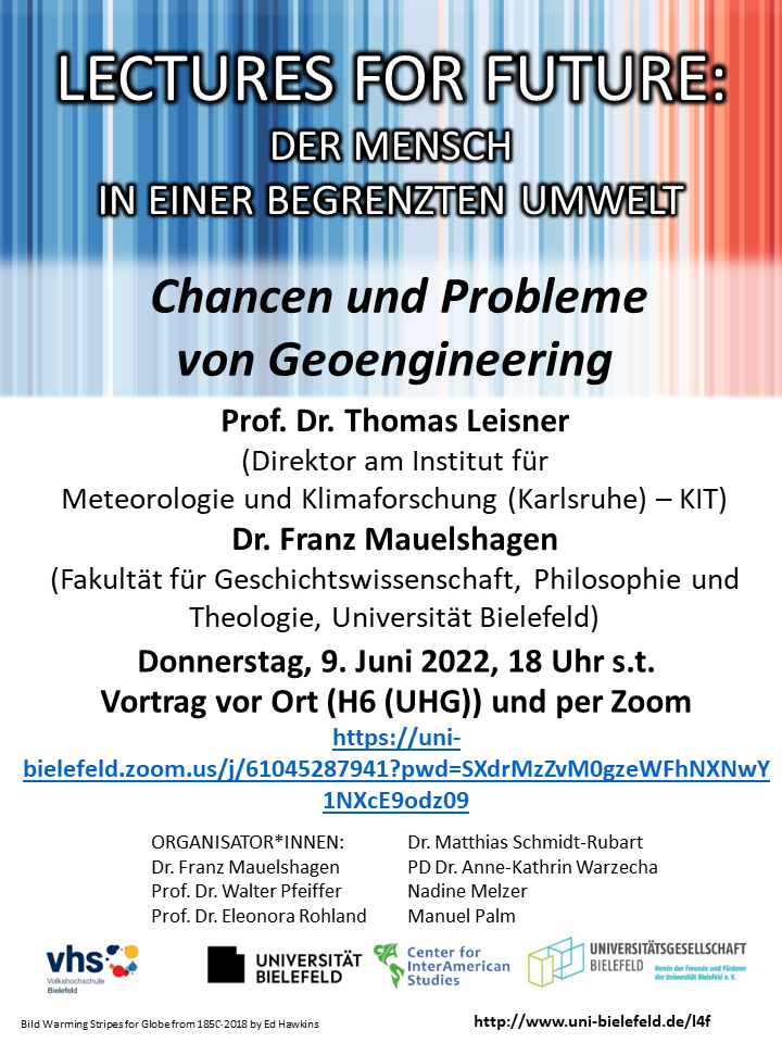 Prof. Dr. Thomas Leisner (Direktor am Institut für Meteorologie und Klimaforschung – KIT, Karlsruhe) und Dr. Franz Mauelshagen (Fakultät für Geschichtswissenschaft, Philosophie und Theologie, Universität Bielefeld) werden zu dieser Fragestellung Kurzvorträge halten an die sich eine moderierte Diskussion mit Publikumsbeteiligung anschließt. Die Veranstaltung findet in Präsenz (Maskenplicht) statt. Zusätzlich gibt es die Möglichkeit per Zoom an der Veranstaltung teilzunehmen: