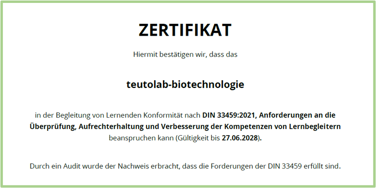 Das teutolab-biotechnologie der Universität Bielefeld wurde 2024 im Rahmen des Projekts „LFB-Labs digital“ (Laufzeit 2023–2025) von der Technischen Universität Dresden nach der DIN 33459:2021 zertifiziert. Diese Norm legt Anforderungen an die Überprüfung, Aufrechterhaltung und Verbesserung der Kompetenzen von Lernbegleiter*innen fest. Mit der erfolgreichen Auditierung wurde bestätigt, dass das teutolab-biotechnologie die hohen Qualitätsanforderungen dieser DIN-Norm erfüllt.