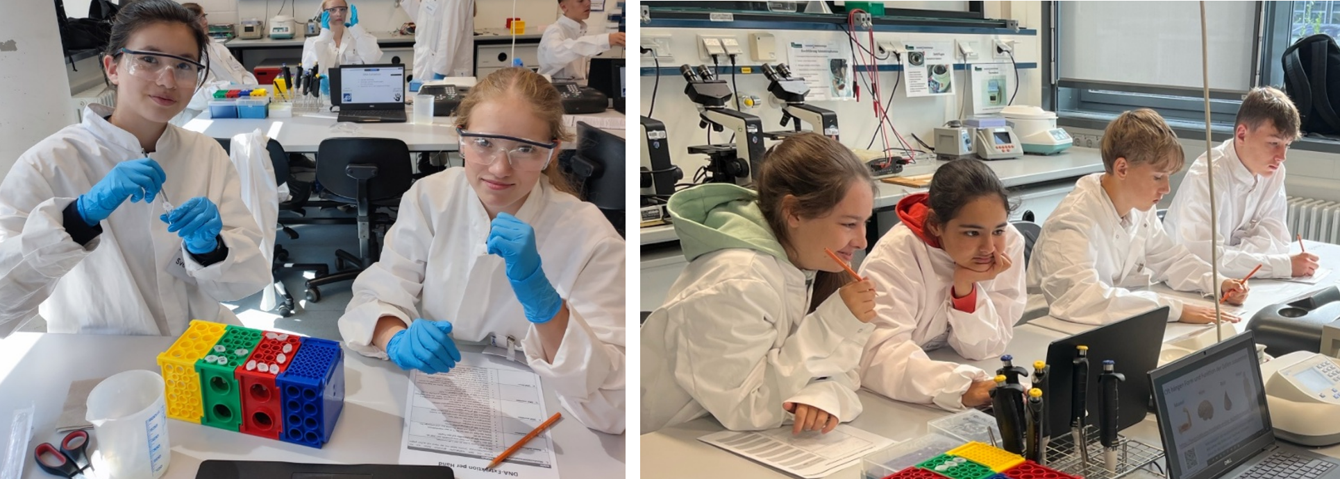 Dabei setzten sich die Jugendlichen experimentell mit zentralen medizinischen Fragen auseinander: Wie funktioniert das Verdauungssystem? Welche Aufgaben erfüllt das Herz-Kreislauf-System? Welche Bedeutung hat das Immunsystem? Außerdem erforschten sie, wie der Körper von der Zelle über Gewebe und Organe bis hin zu Organsystemen aufgebaut ist und welche Rolle die Erbinformation dabei spielt. Zur Beantwortung dieser Fragen führten die Schüler*innen unterschiedliche Experimente durch – darunter Experimente zur Virusdiagnostik, zur Charakterisierung von Bakterien, zur Blutgruppenbestimmung oder zur enzymatischen Spaltung von Milchzucker. Außerdem untersuchten sie ein Schweineherz und machten diverse mikroskopische Untersuchungen.