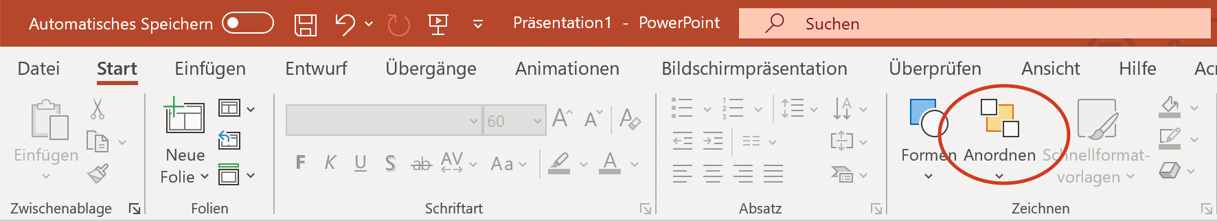 Wählen Sie auf der Registerkarte Start im Bereich Zeichnen die Option Anordnen aus. Wählen Sie in dem Menü die die Option Auswahlbereich aus.