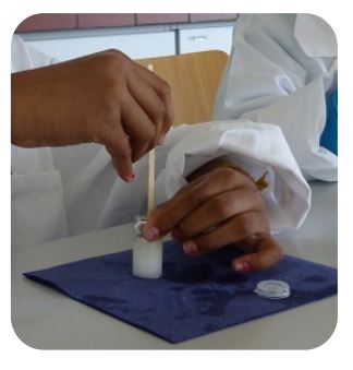 Danach wurde eine alltägliche Problemstellung aufgeworfen, wobei die Schülerinnen und Schüler über eine Lösung nachdenken sollten. ‚Was kann man gegen trockene, raue Hände machen?‘ Schnell fiel der Begriff Creme. Aber warum sind einige Cremes fester und andere eher flüssig? Nach einer theoretischen Erklärung der Zusammenhänge und Unterschiede von Wasser und Öl, durften die Schülerinnen und Schüler selbst eine Creme herstellen und anschließend untersuchen, in welcher Creme sich Rote-Beete-Pulver besser löst. Damit konnten sie den Emulsionstyp verschiedener Cremes (z.B. Bodylotion, Handcreme) bestimmen.