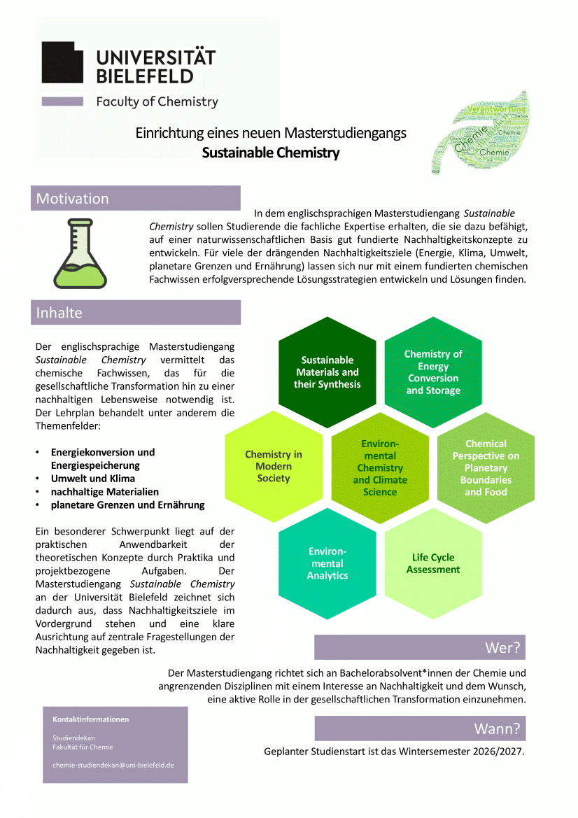 In dem englischsprachigen Master "Sustainable Chemistry" werden Studierende die fachliche Expertise erhalten, die sie dazu befähigt, Nachhaltigkeitskonzepte gut fundiert auf einer naturwissenschaftlichen Basis zu entwickeln. Aufbauend auf einem naturwissenschaftlichen Bachelorstudiengang werden im Master die drängenden gesellschaftlichen Fragestellungen bei der Transformation zu einer nachhaltigeren Lebensweise in den Vordergrund gestellt und aus dem Blickwinkel der Chemie behandelt werden. Dementsprechend werden sich die geplanten Module bestimmten Nachhaltigkeitszielen widmen, denen sich die nötigen fachlichen Inhalte unterordnen. Master-Studierende werden an aktuellen Forschungsthemen direkt mitwirken.