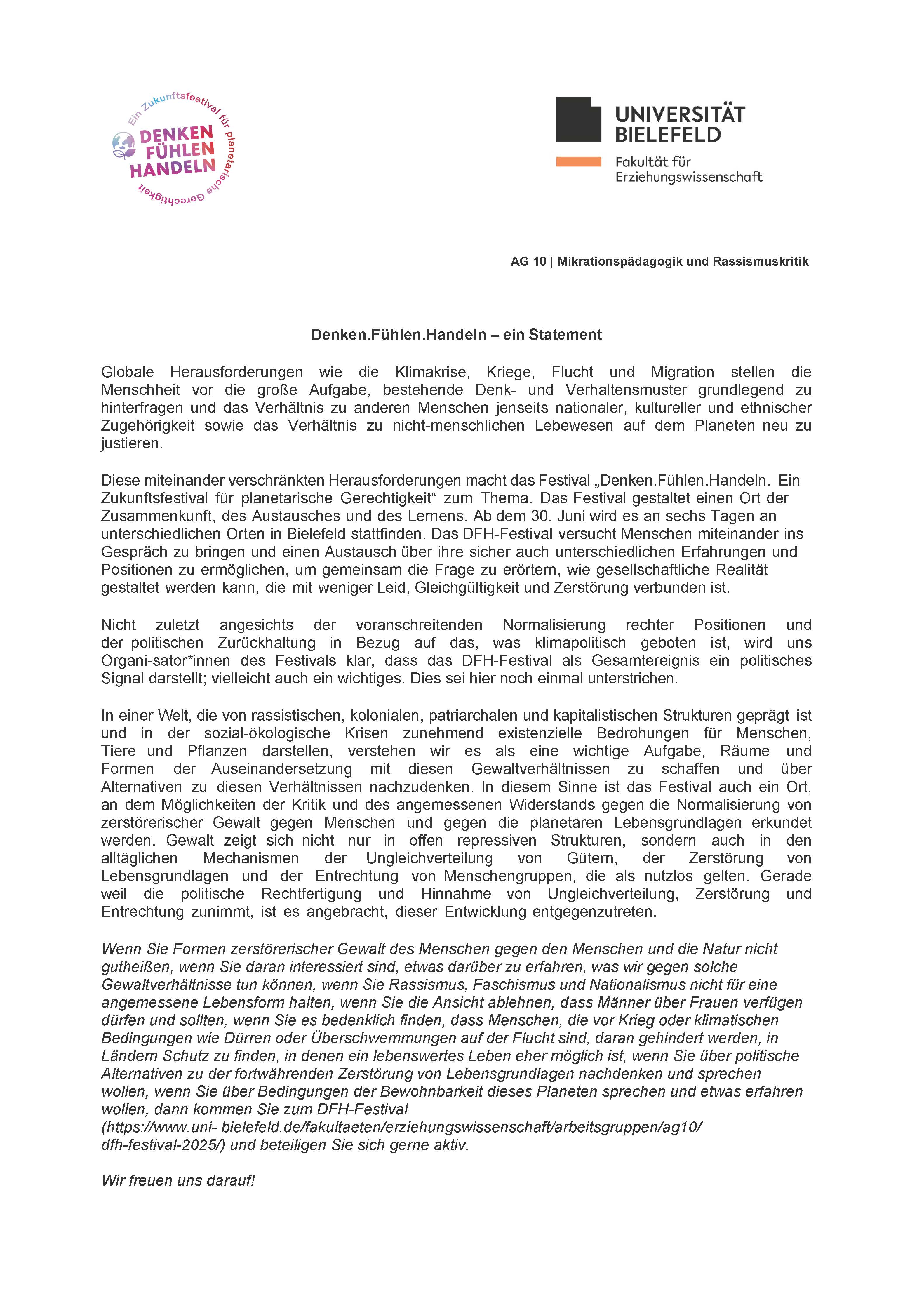 Das sechstägige Festival "DenkenFühlenHandeln - Ein Zukunftsfestival für planetarische Gerechtigkeit“ widmet sich der Frage, wie planetar gedacht, gefühlt und gehandelt werden kann. Die Vorbereitung des Festivals und damit das Festival selbst ist konzipiert als offenes Projekt, an dem teilzunehmen alle eingeladen sind, die an der Frage planetarer Gerechtigkeit interessiert sind und sich mit ihren Fragen, Ideen und Anliegen beteiligen möchten. Das Leitmotiv an dieser Stelle lautet: keine Frage, keine Idee, kein Anliegen ist zu simpel oder zu trivial. Um Mitwirkende zu gewinnen, werden wir, die Veranstalterinnen des Festivals, unterschiedliche Institutionen und Akteur:innen in Bielefeld kontaktieren und zu einer Kooperation einladen. Haben Sie Interesse mitzumachen? Dann treten Sie gerne mit uns in den Kontakt!