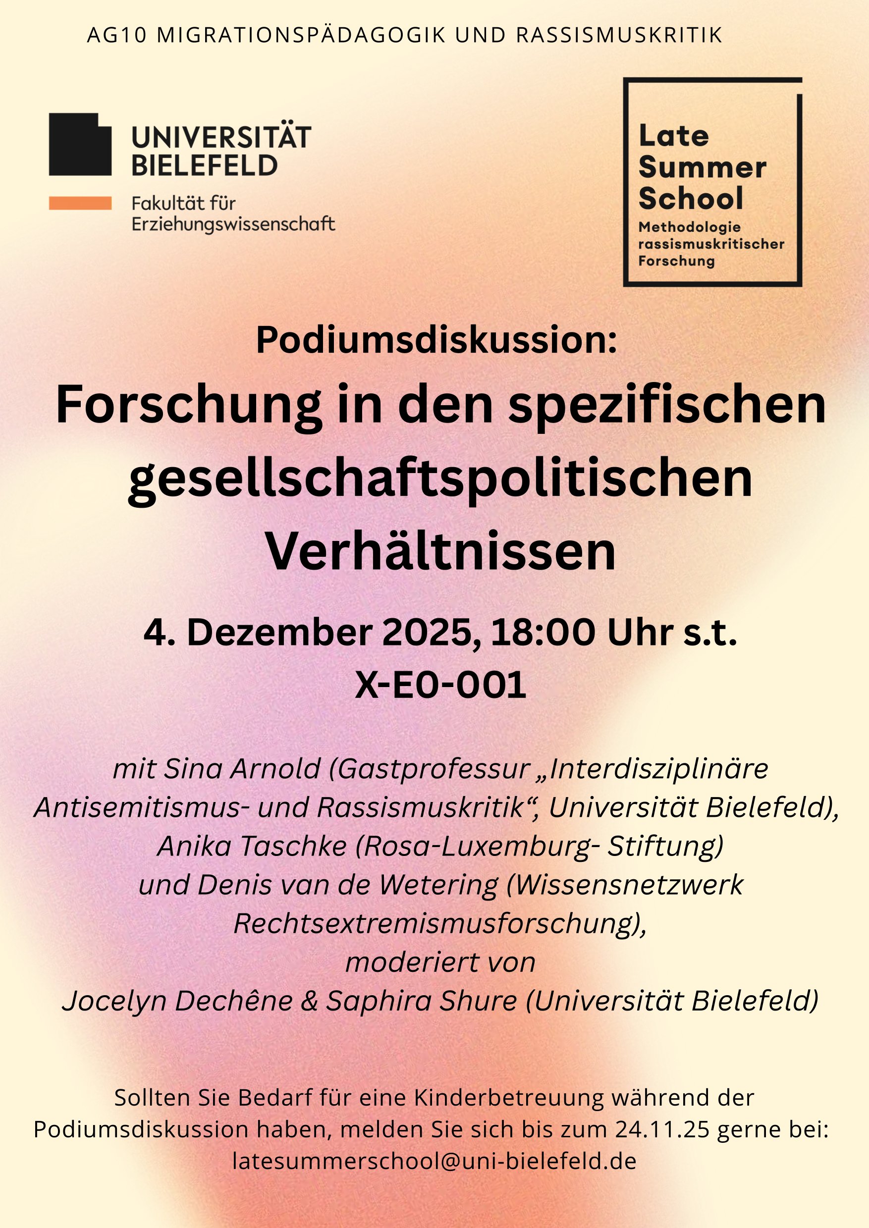 Mit der Late Summer School „Methodologie rassismuskritischer Forschung“, die 2022 erstmalig von der AG 10 Migrationspädagogik und Rassismuskritik an der Universität Bielefeld durchgeführt wurde und nunmehr regelmäßig an einem der ersten Wochenenden im Dezember stattfindet, wird ein Rahmen geschaffen, in dem entlang der Auseinandersetzung mit eigenen empirischen Studien methodische und methodologische Fragen der Rassismusforschung bzw. der rassismuskritischen Forschung in einer eher sondierenden und dialogischen Form möglich ist. Unterschiedliche Elemente kennzeichnen die Late Summer School: Arbeit in Interpretationswerkstätten an empirischem Material aus der Rassismusforschung, Impulse von externen Referent:innen und selbstorganisierte Arbeit. Um uns diesen Fragen anzunähern und einen Raum zu schaffen, in welchem auf mehreren Ebenen (etwa: Praktiken der Herabwürdigung kapitalismus-, rassismus- oder patriarchatskritischer Ansätze oder Risiken in und durch Forschung für (etwa rassistisch diskreditierbare) Forscher:innen) über die Involviertheit rassismuskritischer Forschung in gesellschaftspolitische Verhältnisse gesprochen werden kann, werden Fragen, Ergebnisse und Erfahrungen aus laufenden und abgeschlossenen Forschungsprojekten thematisiert.