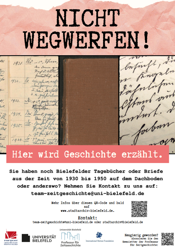 Ob beim Entrümpeln des Dachbodens, bei einem Umzug oder bei einer Haushaltsauflösung: Dokumente aus vergangenen Zeiten tauchen im Alltag immer wieder auf. Historikerinnen und Historiker am Arbeitsbereich Zeitgeschichte der Universität Bielefeld beschäftigen sich unter der Leitung von Prof. Dr. Christina Morina in einem Forschungsprojekt mit der Gesellschafts- und Erfahrungsgeschichte des Nationalsozialismus. Gemeinsam mit dem Bielefelder Stadtarchiv sind wir dafür auf der Suche nach noch unerforschten nicht-jüdischen und jüdischen Zeitzeugnissen aus Bielefeld und Umgebung.