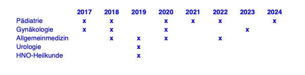 – ärztliche Weiterbildung Allgemeinmedizin: wird bundesweit begleitet durch ein (freiwilliges) strukturiertes Seminarprogramm über 5 Jahre; in den Kompetenzzentren Weiterbildung Allgemeinmed. hat ABS hier einen festen Stellenwert; in Bielefeld wird ABS im Rahmen der Seminarthemen „Husten“, „COPD und Asthma“, „Infekte des Urogenitaltraktes“, „Weichteilinfektionen“ und „Wundversorgung“ sowie „Abdominalerkrankungen“ und „HNO Erkrankungen in der hausärztlichen Praxis“ behandelt.