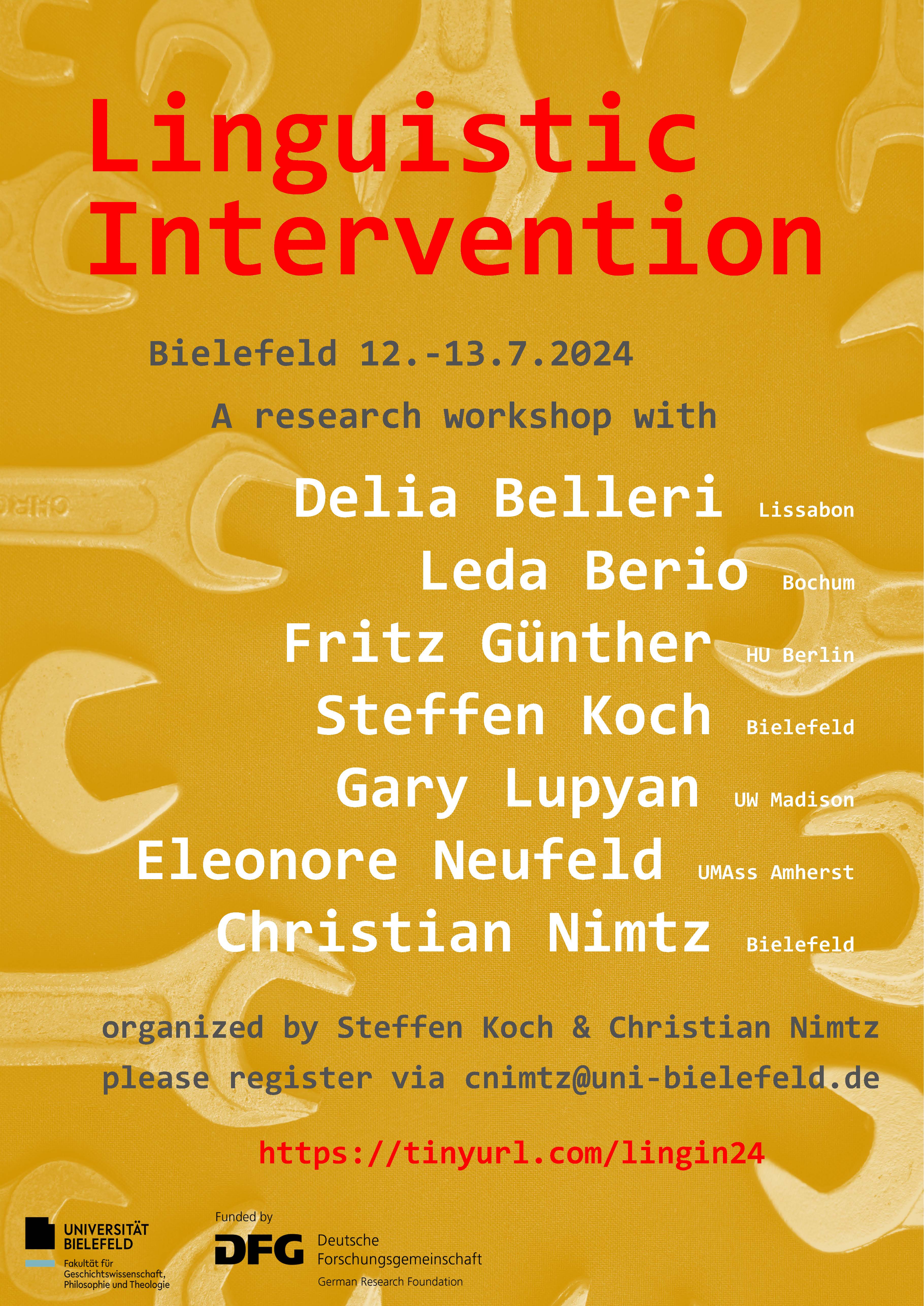Here is a list of speakers: Delia Belleri (Lisbon), Leda Berio (Bochum), Fritz Günther (HU Berlin), Steffen Koch (Bielefeld), Gary Lupyan (Wisconsin-Madison), Eleonore Neufeld (UMass Amherst), and Christian Nimtz (Bielefeld).