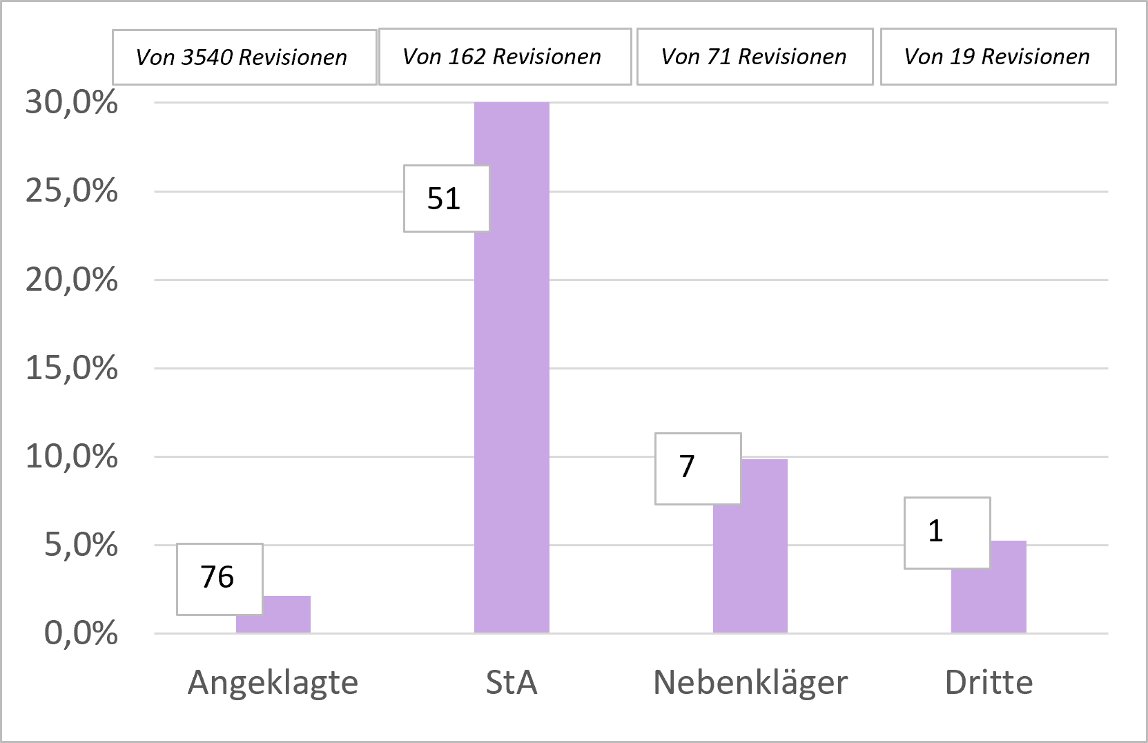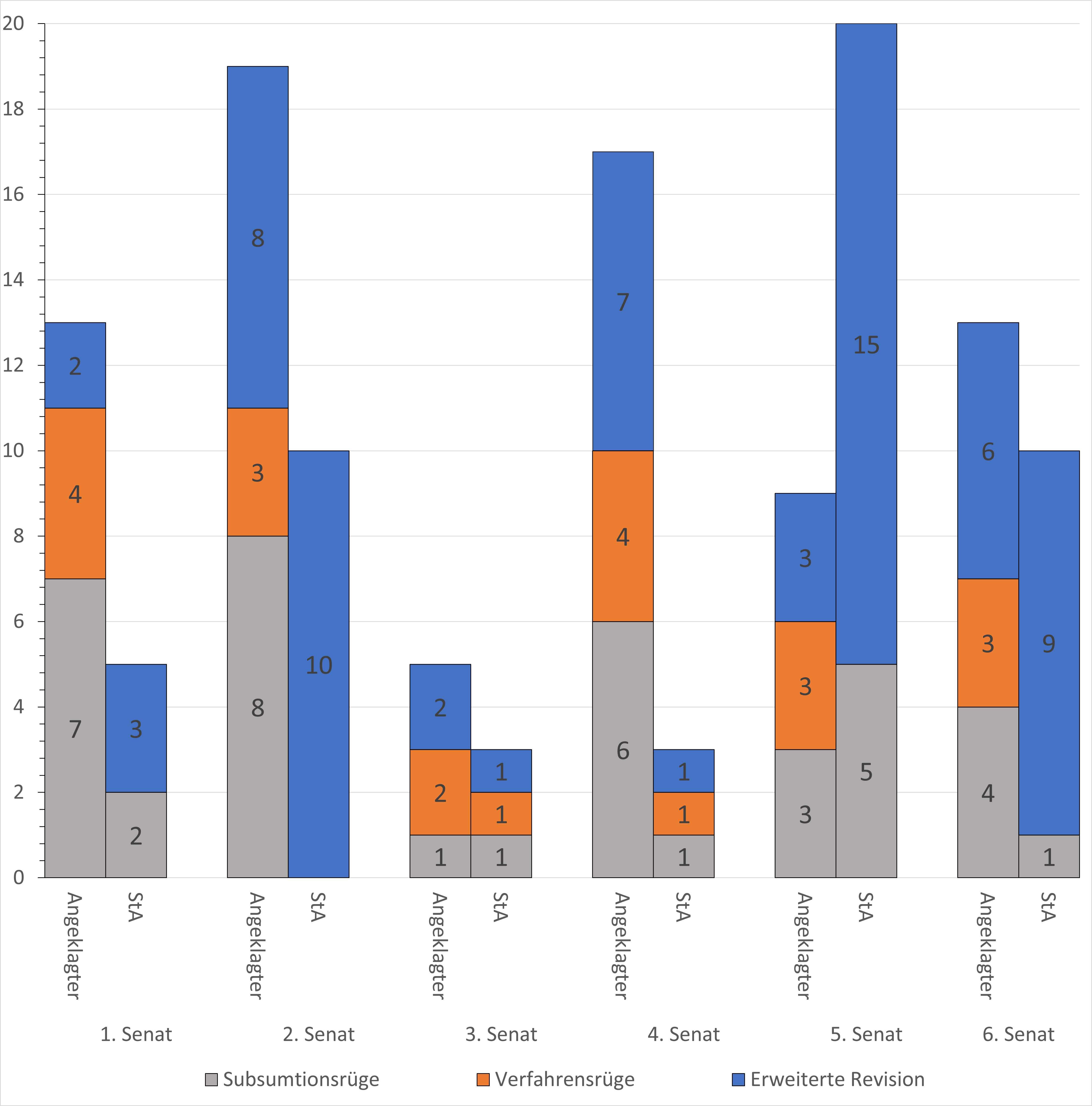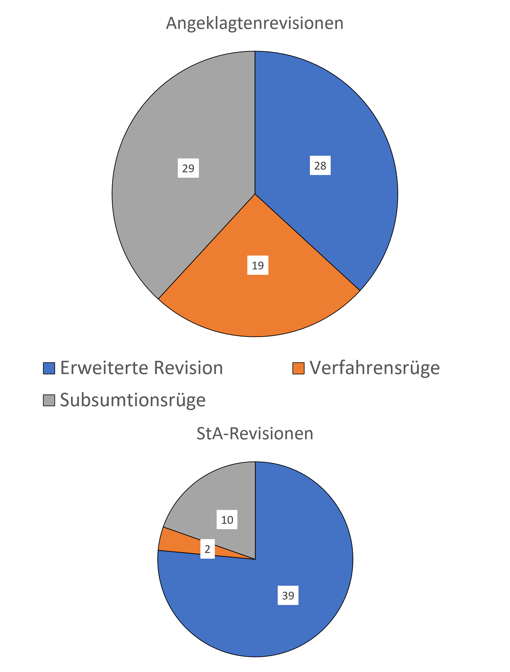 Insgesamt wurde so das Schicksal von 1454 Revisionen erfasst. Überwiegend handelte es sich dabei um Revisionen, die für Angeklagte eingelegt wurden (1248), daneben um insgesamt 162 StA-Revisionen, 33 Revisionen von Nebenklägern und 11 von Einziehungsbeteiligten. Diese 1454 Revisionen stellen aber keinesfalls die Gesamtheit der 2022 durch die BGH-Strafsenate entschiedenen Revisionen dar. Es fehlen dieser Sammlung alle ohne inhaltliche Begründung ergangenen Revisionen. In der Praxis geschieht dies nicht selten; betroffen sind dabei ausschließlich solche Revisionen, die als offensichtlich unbegründet gemäß § 349 Abs. 2 StPO angesehen werden. Vom Präsidium des BGH wurden Daten über die Gesamtheit der 2022 eingegangenen Revisionen zur Verfügung gestellt, aufgeschlüsselt nach Beschwerdeführern und Senaten – jedoch nicht nach Erledigungsformen. Ferner hat die Generalbundesanwaltschaft Daten zu den von den Bundesanwälten hinsichtlich der 2022 eingegangenen Revisionen mitgeteilt.