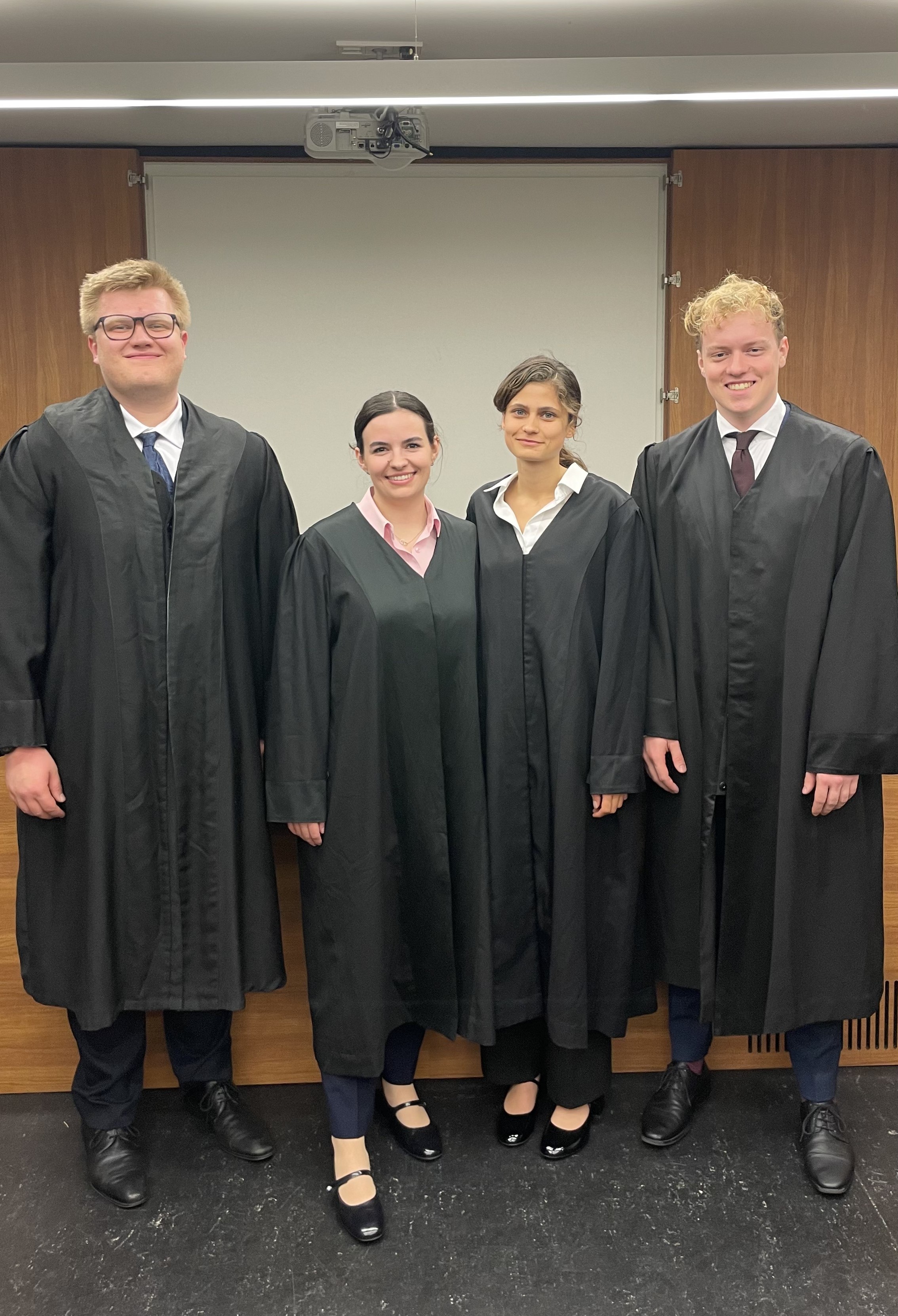 Im September und Oktober folgt schlileßlich das Highlight des Moot Courts: die mündlichen Verhandlungen und die Vorbereitung hierauf. In den mündlichen Verhandlung sitzen immer jeweils zwei Teilnehmende des Teams einer Universität zwei Teilnehmenden des Teams einer anderen Universität gegenüber, die eine Seite vertritt die Klägerin, die andere Seite die Beklagte. Während der Verhandlung wird dann für die Dauer von 60 Minuten über die juristischen Probleme des Falles diskutiert, geleitet von Professor:innen, Richter:innen und Anwält:innen, die die Moot Court Richter:innen spielen.