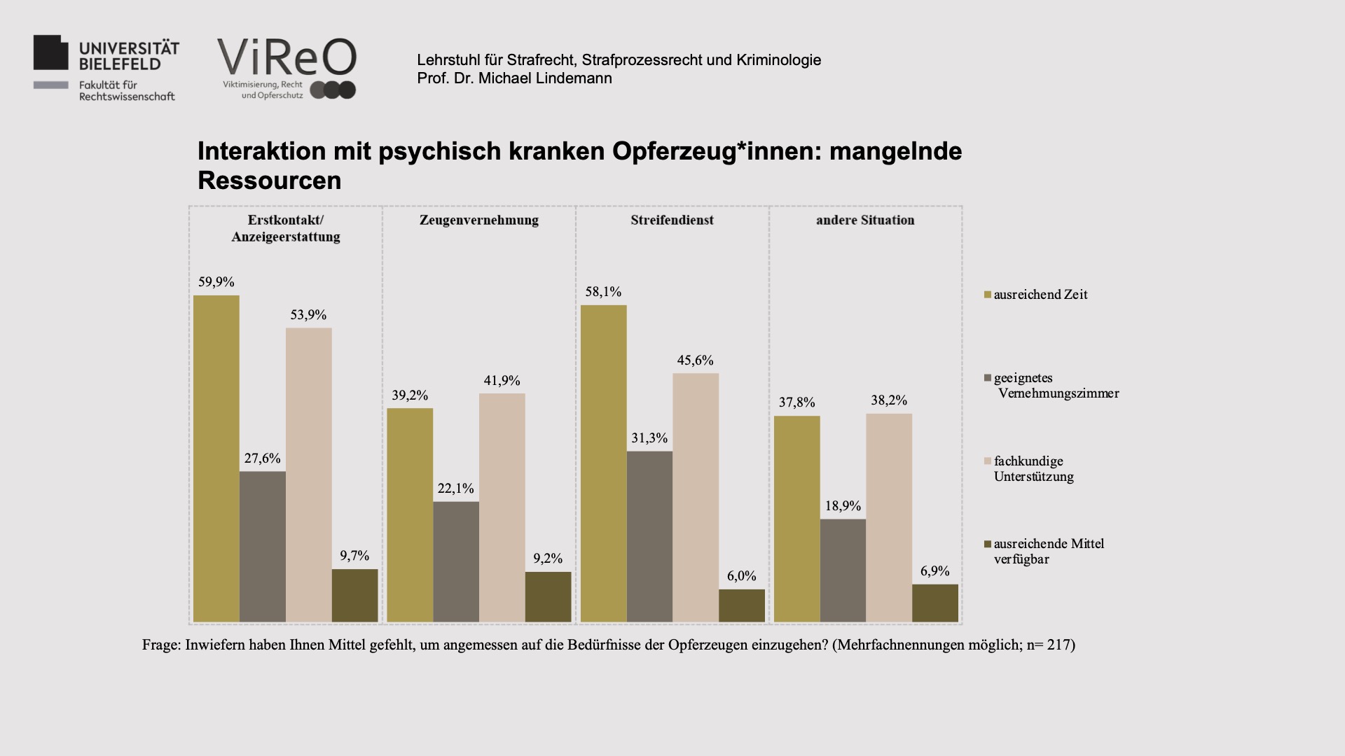 Am 05.02.2021 veranstaltete der Lehrstuhl für Strafrecht, Strafprozessrecht und Kriminologie in Kooperation mit der Forschungsabteilung des evangelischen Klinikums Bethel einen virtuellen Fachtag, welcher als Abschlussveranstaltung des Forschungsprojektes „ViReO – Viktimisierung, Recht und Opferschutz“ der Vorstellung der wissenschaftlichen Ergebnisse diente. Getreu dem multiperspektivischen Konzept des Forschungsprojektes schloss auch der Fachtag mit einer multiperspektivischen Podiumsdiskussion, in der neben Akteur*innen von Polizei und Justiz auch Akteur*innen von Bielefelder Opferhilfestellen sowie Betroffene zu Wort kamen.