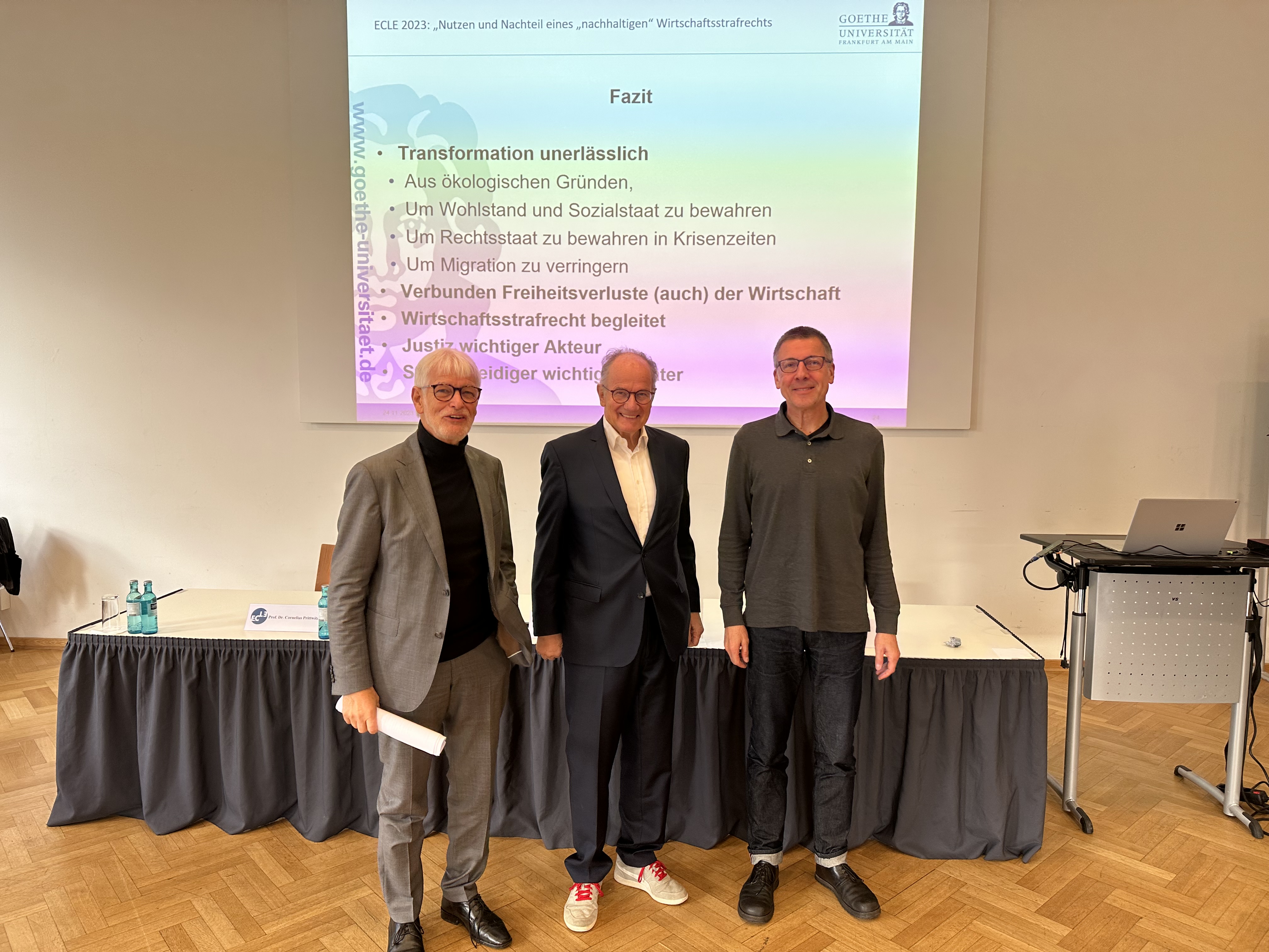Am 24./25.11.2023 fand an der Goethe-Universität ECLE XIII: Nutzen und Nachteil eines "nachhaltigen" Wirtschaftsstrafrechts statt. Im Zentrum des Symposions stand die – scheinbare – Ambivalenz zwischen Wirtschaft und Nachhaltigkeit sowie die Strategien des Rechts, sogenannte „externe Effekte“ des Wirtschaftens zu internalisieren und Steuerungsparadoxien zu beseitigen.