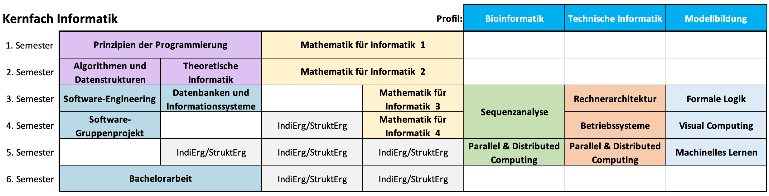 Der Studiengang Informatik kann als Kernfach studiert werden und schließt mit dem akademischen Grad Bachelor of Science (B. Sc.) ab. Als Vorbereitung auf das Berufsleben orientiert sich die Ausbildung an den Anforderungen der Industrie, aber auch an den Voraussetzungen für eine spätere wissenschaftliche Tätigkeit. Im Bereich der Mathematik werden daher mit Linearer Algebra, Analysis und Differentialgleichungen sowie Statistik und Stochastik die formalen Grundlagen für die Informatikausbildung gelegt. Im Bereich der Informatik werden die „kanonischen“ Fächer der Informatik (Algorithmen und Datenstrukturen, Technische Informatik, Techniken der Software-Projektentwicklung, Datenbanken, Grundlagen theoretischer Informatik) gelehrt. Neben der fundierten Ausbildung für das spätere Berufsleben wird dadurch auch der Wechsel in eine möglichst große Zahl von Masterstudiengängen der Informatik ermöglicht. Bezüglich der Berufsqualifizierung sind insbesondere das projektorientierte Modul Softwareprojekt und die Bachelorarbeit hervorzuheben. Programmierpraktische Kenntnisse werden zusätzlich zu den Modulen „Objektorientierte Programmierung“ und „Software Engineering“ auch in den Modulen „Algorithmen und Datenstrukturen“ (imperatives und funktionales Programmieren) und Technische Informatik (u.a. maschinennahe Programmierung mit C, Assemblerprogrammierung) vermittelt.