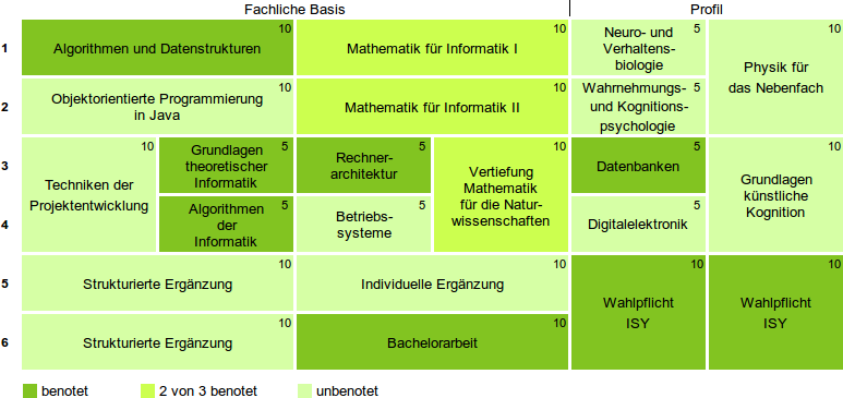 Der Bachelorstudiengang Kognitive Informatik umfasst 180 Leistungspunkte mit einer Regelstudienzeit von 6 Semestern.