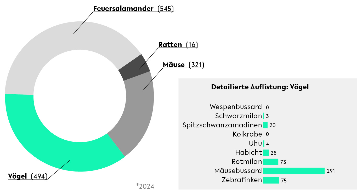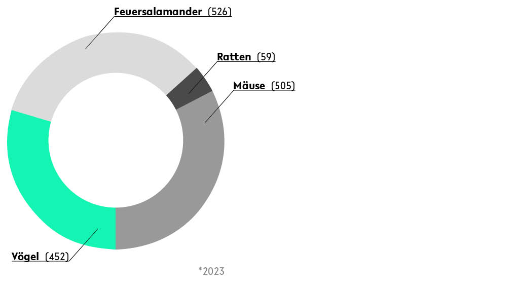 Für eine höchstmögliche Transparenz werden auf diesen Seiten auch Informationen über die Tiere zusammengefasst, die nach den Vorgaben des Tierschutzgesetzes nicht für Tierversuche gemeldet werden müssen oder die in den letzten Jahren nicht für die Forschung eingesetzt wurden.
