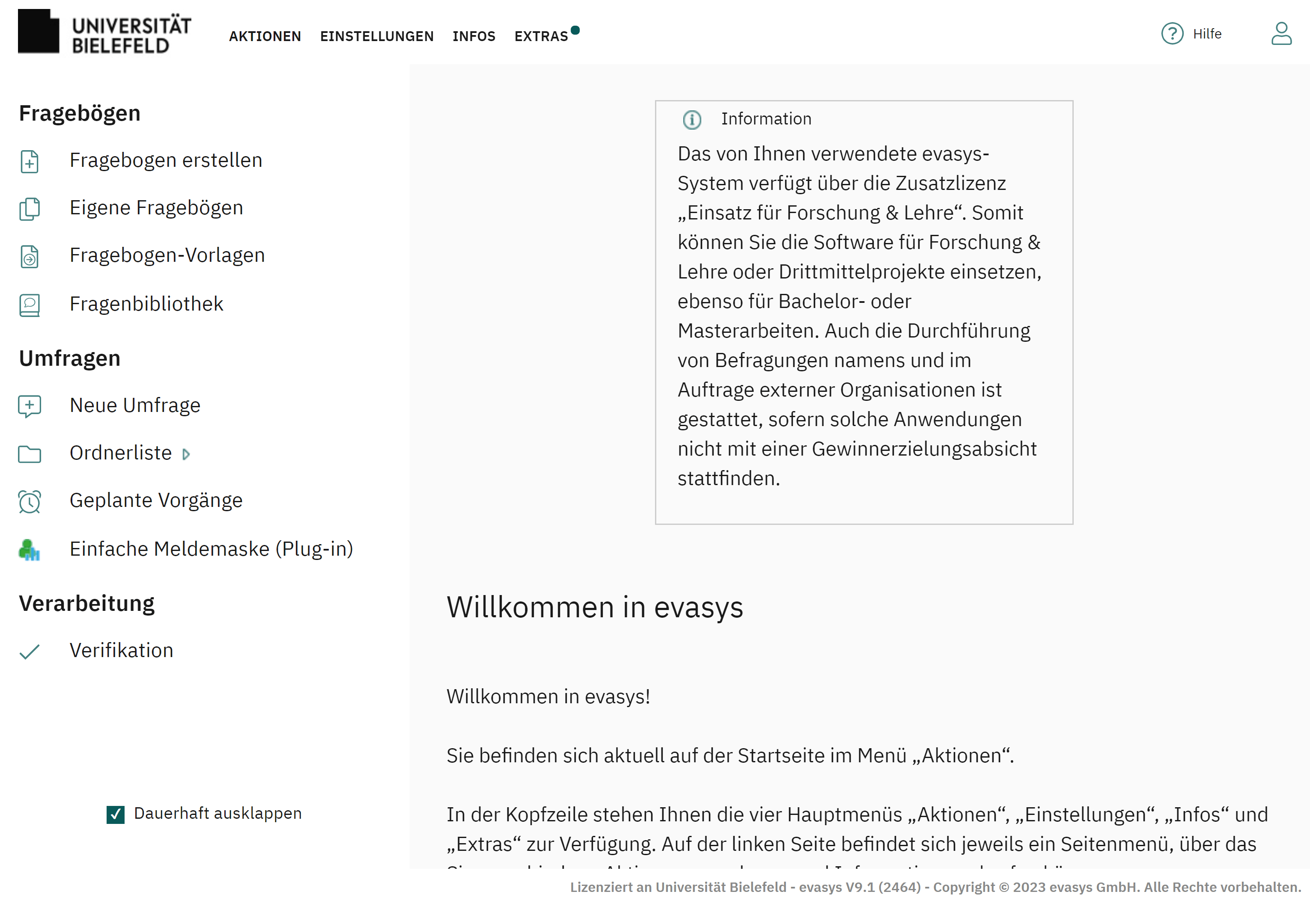 Nach dem Login in Ihr evasys-Nutzungskonto befinden Sie sich auf der „Willkommen-Seite“. Auf der „Willkommen-Seite“ werden Ihnen kurz und knapp die Bereiche des Hauptmenüs in der Kopfzeile (Aktionen/Einstellungen/Infos/Extras) und ihre jeweiligen Funktionen erklärt. Im Folgenden werden die jeweiligen Seitenmenüs der einzelnen Hauptmenüs vorgestellt.