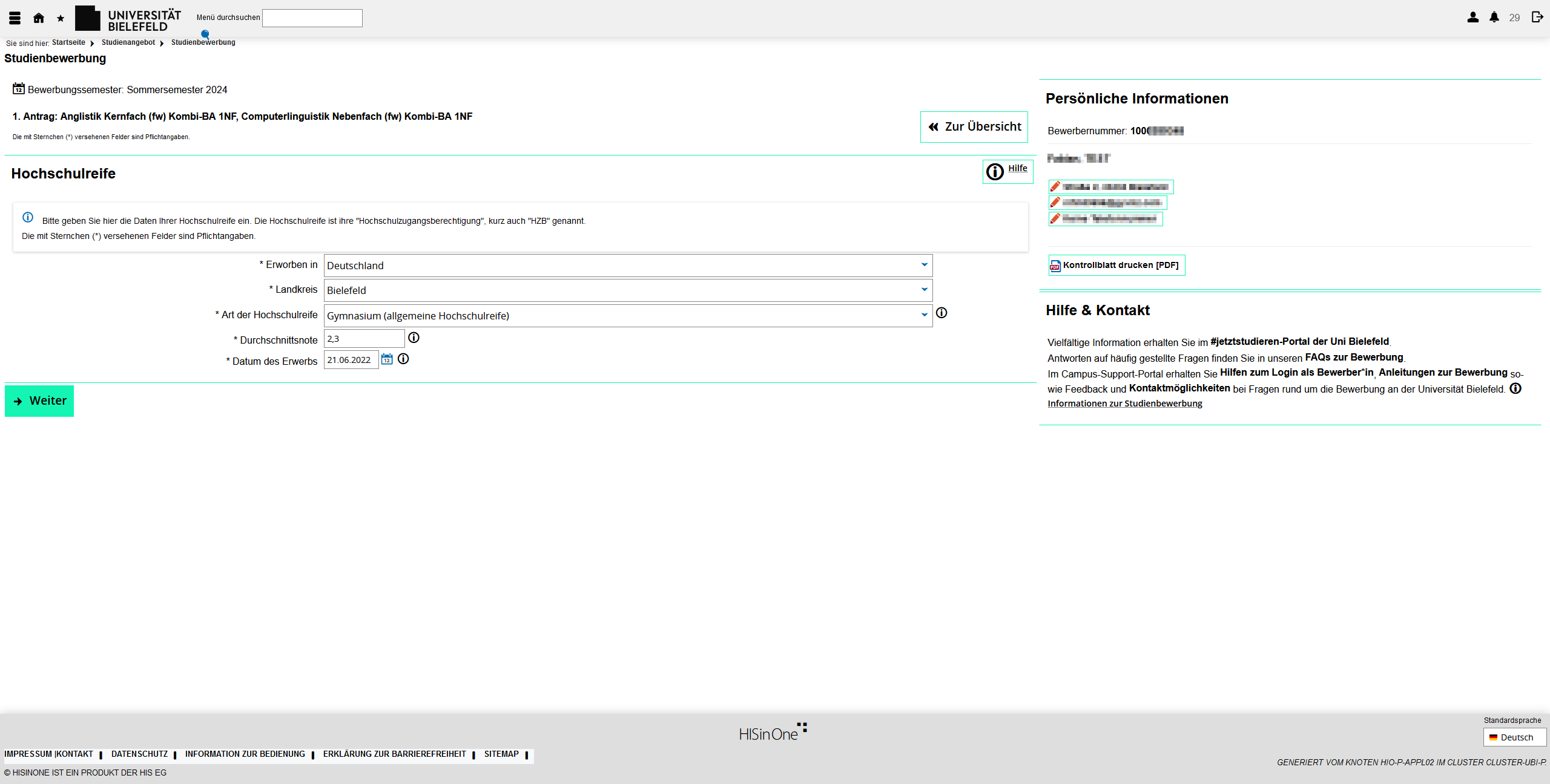 Im nächsten Schritt müssen Angaben zur Hochschulzugangsberechtigung (in den meisten Fällen „Abitur“) gemacht werden. Da dafür Datum und Note des Zeugnisses benötigt werden, ist eine Bewerbung vor Ausstellung des Zeugnisses nicht möglich (und auch nicht nötig, denn die Chancen auf Zulassung verändern sich dadurch nicht).