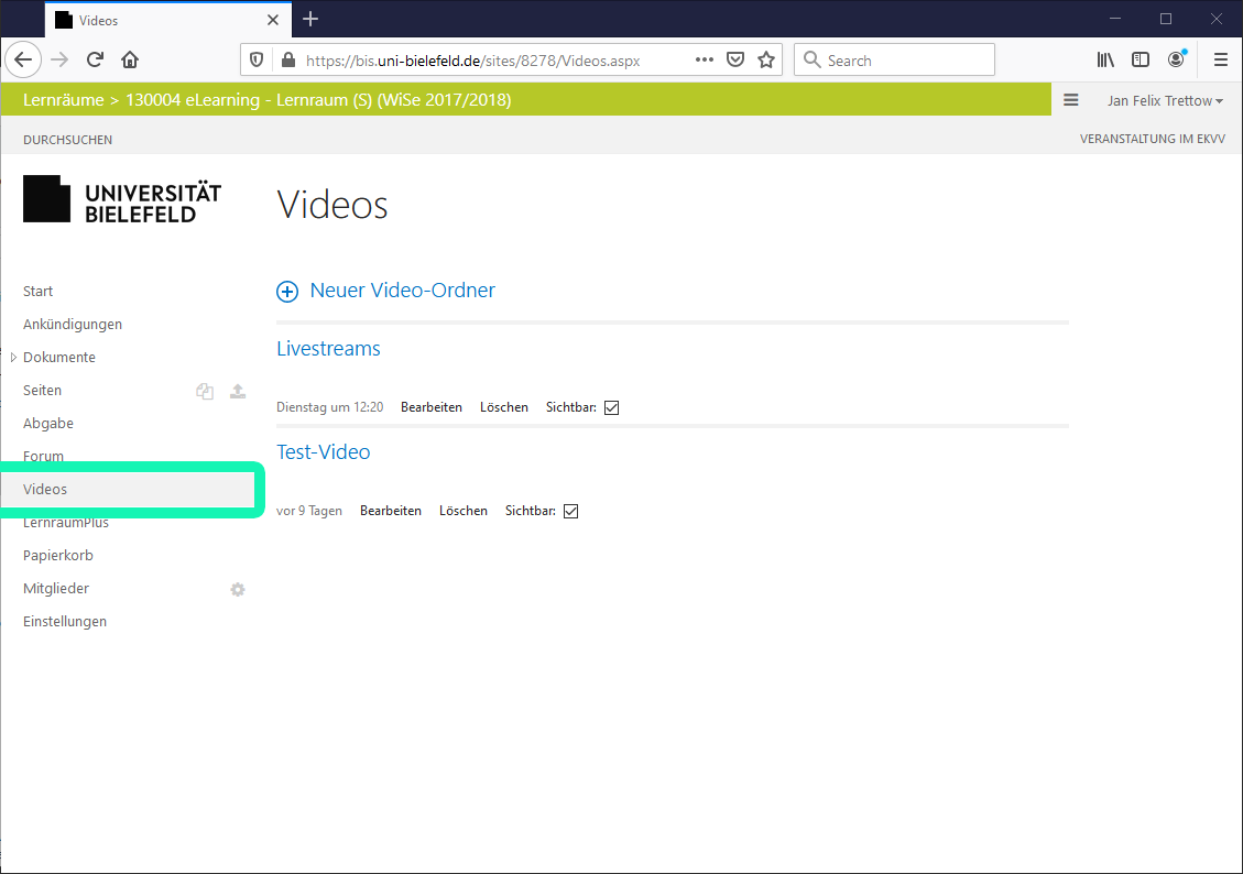 1) Öffnen Sie Ihren Lernraum und klicken Sie auf "Videos" in der Navigation. Hier sehen Sie alle bereits für die Veranstaltung existierenden Video-Ordner. Im Beispiel-Screenshot existieren bereits zwei Video-Ordner.