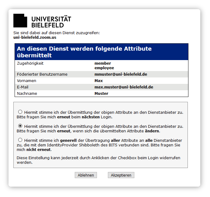 3) Möglicherweise müssen Sie nun noch einer Attributübermittlung zustimmen. Wählen Sie die gewünschte Option und wählen Sie [Akzeptieren].