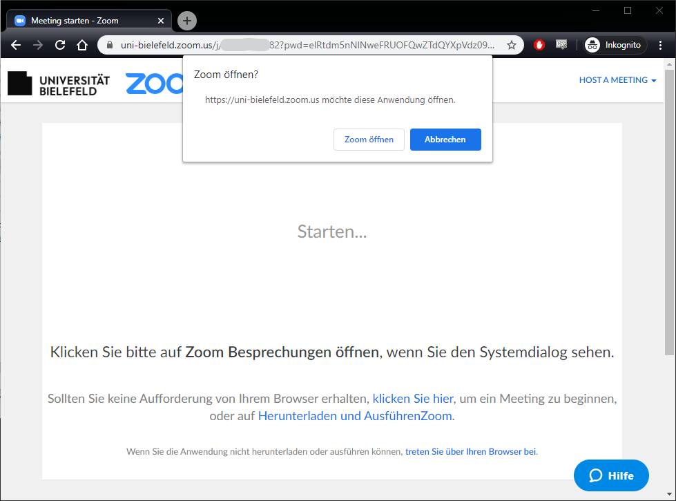 1) Öffnen Sie den Meeting-Link mit Ihrem Browser und wählen Sie [Abbrechen] (o.ä.), wenn der Browser einen Download starten oder Zoom öffnen möchte.