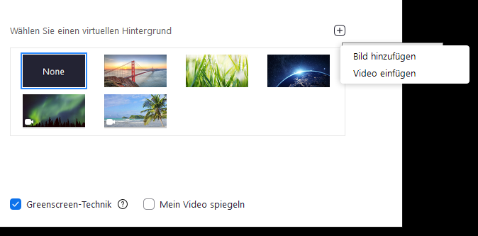 4) Sie können unter "Wählen Sie einen virtuellen Hintergrund" nun ein vorgegebenes Hintergrundbild verwenden oder über das [+]-Icon und "Bild einfügen" ein eigenes Bild hochladen und danach auswählen. Wenn Sie Ihr Kamerabild spiegeln, wird auch das virtuelle Hintergrundbild gespiegelt.
