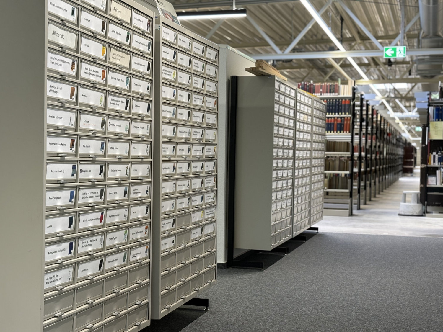 Um mehr Platz für frei zugängliche Medien und Arbeitsplätze zu schaffen, werden im Zuge des Bestandsumzugs ältere Zeitschriften in die Sonderaufstellungsbereiche verlagert. Solche Schriften können dann wie alle anderen magazinierten Medien über den Katalog.plus! bestellt werden.