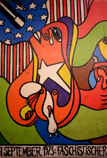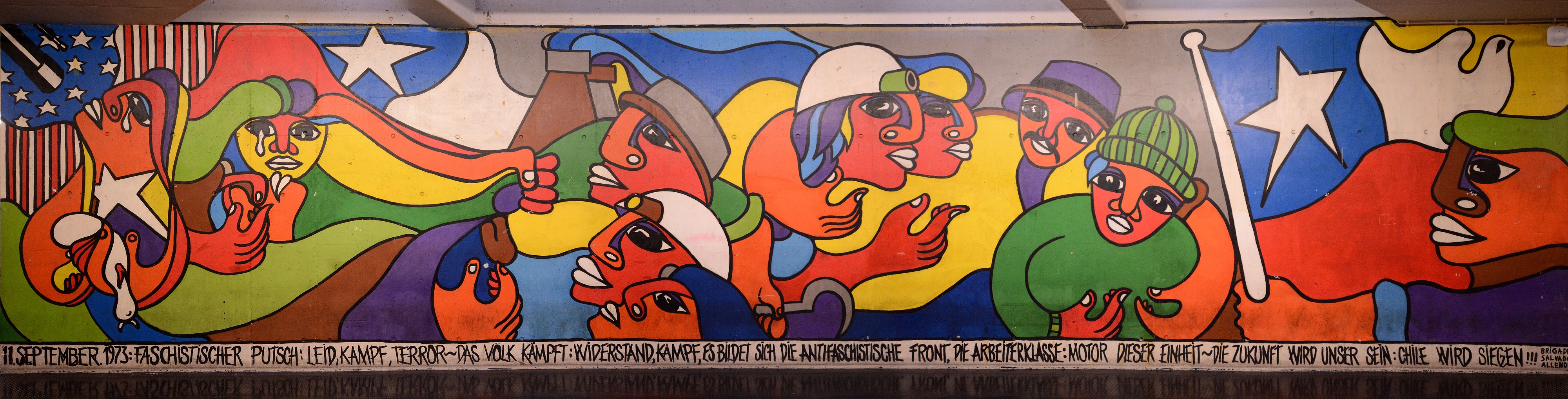 Symbol für Konfliktkultur: Das Chile-Wandbild aus dem Jahr 1973. Das unter Denkmalschutz stehende 16 Meter breite und 4 Meter hohe Mural wurde während der Sanierungsarbeiten besonders geschützt. Mit seiner Botschaft und seiner Farbgestaltung bringt es einen besonderen Akzent in den neu sanierten Bereich.