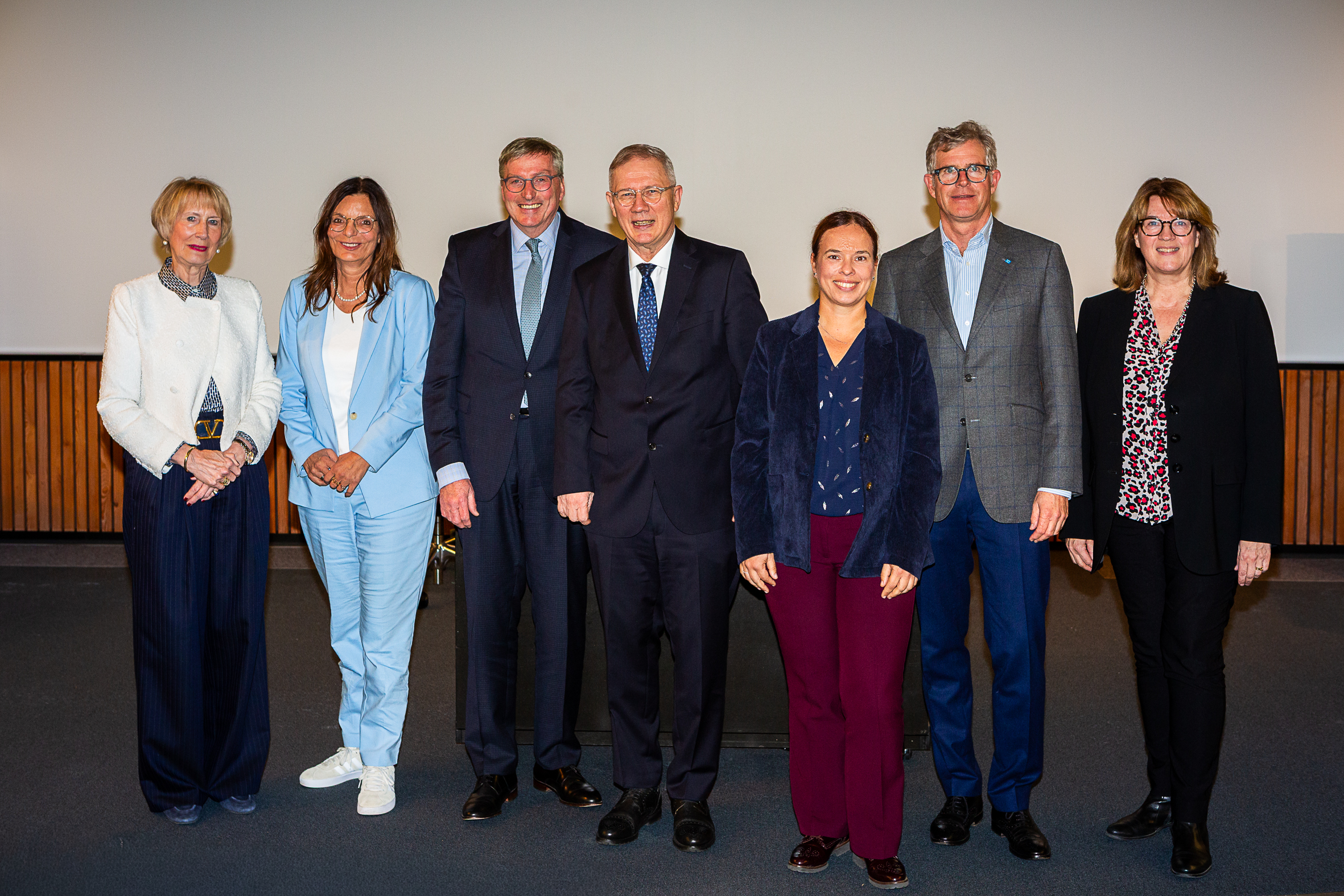 Der 2025 gewählte Vorstand der Universitätsgesellschaft Bielefeld (v. l.): Dr. Birgit Osterwald, Herfords Bürgermeisterin Anke Theisen, Martin Henke, der als Geschäftsführer agiert, Vorsitzender Dr. Rainer Norden, Konstantina Kanellopoulos, Wilhelm A. Böllhoff, Kathrin Stühmeyer-Halfar. Auf dem Foto fehlen Bielefelds Oberbürgermeisterin Dr. Christiana Bauer, die nach der Wahl weitere Termine wahrnehmen musste, und Dr. Jörn Stöppel, der als Schatzmeister gewählt wurde.