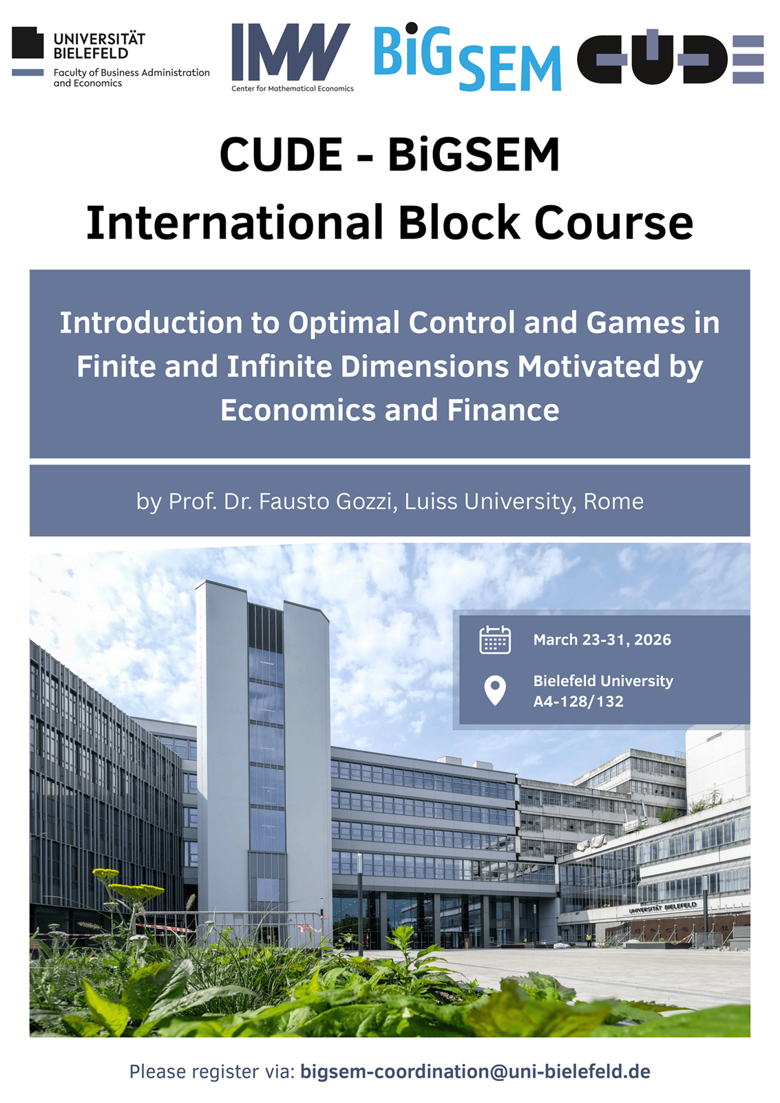 The Research Training Group 2865 offers excellent career opportunities for doctoral students in an exciting environment, starting October 1st 2023. We offer up to twelve doctoral positions, fully funded for four years. You will be integrated into the Bielefeld Graduate School of Economics and Management, one of the oldest and best established doctoral schools in economics in Germany. You will work with a group of ten principal investigators from the Center for Mathematical Economics and the Data Science Group. Next to the doctoral education at the top international level, you will carry out research in the analysis of uncertainty in dynamic economies.